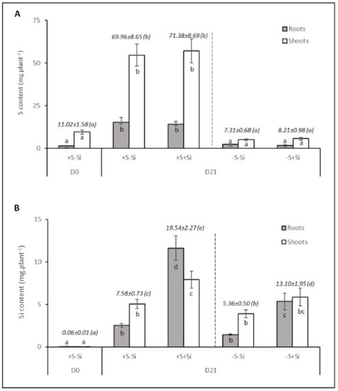 Roots, shoots and total contents of S (A) and Si (B) in Brassica napus L. cultivated in hydroponic conditions for 21 days (21D) with (+S; 500 µM) or without sulfur (–S; 0 µM) concentrations and with (+Si; 1.7 mM) or without silicon (–Si) supply. Italic values indicate the content S or Si in whole plant (mg plant−1). Data are means ± SE (n = 4). Different Latin letters indicate that the S or Si content in whole plant or in each plant compartment (roots or shoots) are significantly different (p < 0.05).