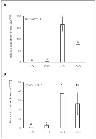 Relative expression of genes encoding the sulfate transporters BnaSultr1.1 (A) and BnaSultr1.2 (B) in roots of Brassica napus L. cultivated in hydroponic conditions for 21 days with (+S; 500 µM) or without sulfur (–S; 0 µM) concentrations and with (+Si; 1.7 mM) or without silicon (–Si) supply. Data are means ± SE (n = 4). Different lowercase letters indicate that means are significantly different (p < 0.05).