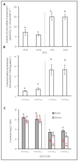 Activity of root sulfate transporters of Brassica napus L. at D21 (A), the S amount taken up between D21 and D21 + 72 h (B), and the S content in the root and shoot compartments of plants at D21 + 72 h (C). Plants were previously cultivated in hydroponic conditions for 21 days with (+S; 500 µM) or without sulfur (–S; 0 µM) concentrations and with (+Si; 1.7 mM) or without Si (–Si) supply and then were resupplied with S for 72 h (+S72h; 500 µM). Data are means ± SE (n = 4). Different lowercase letters indicate that the means are significantly different (p < 0.05). (C) for each treatment, red marks indicate the mean (±SE n = 4) of S content in the plant compartments at 21 days. For each treatment, the red asterisk indicates significant differences (p < 0.05) between the S amounts at D21 and at D21 + 72 h.