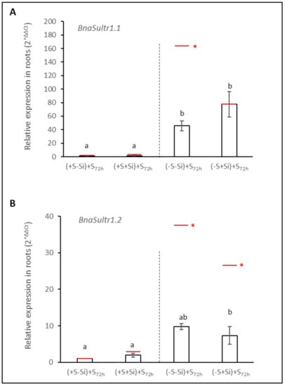Relative expression of genes encoding the sulfate transporters BnaSultr1.1 (A) and BnaSultr1.2 (B) in roots of Brassica napus L. at D21 + 72 h: plants were previously cultivated in hydroponic conditions for 21 days with (+S; 500 µM) or without sulfur (–S; 0 µM) concentrations and with (+Si; 1.7 mM) or without Si supply (–Si) and then were resupplied with S for 72 h (+S72h; 500 µM). Data are means ± SE (n = 4). Different lowercase letters indicate that means are significantly different (p < 0.05). For each treatment, red marks represent the relative expression of each gene observed in roots at 21 days (Figure 5). For each treatment and each gene, asterisks indicate significant differences (p < 0.05) between the relative expression at D21 and at D21 + 72 h.