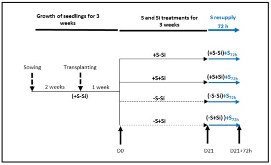 Experimental design used to study the effect of silicon supply on Brassica napus L. grown with or without sulfur for 21 days followed by S supplementation for 72 h. After three weeks of cultivation with sulfur (+S; 500 µM) (D0), plants were separated into four batches: the first two batches (filled black arrow) corresponded to plants that continued to be fed with S (+S; 500 µM) and supplied (+Si; 1.7 mM) or not (–Si) with silicon for 21 days (D21). The other two batches (dotted black arrow) corresponded to plants deficient in S (–S) and supplied (+Si; 1.7 mM) or not (–Si) with silicon. From D21, irrespective of the treatment, all plants were resupplied for 72 h (D21 + 72 h) with S (+S72h; 500 µM) (filled blue arrow).