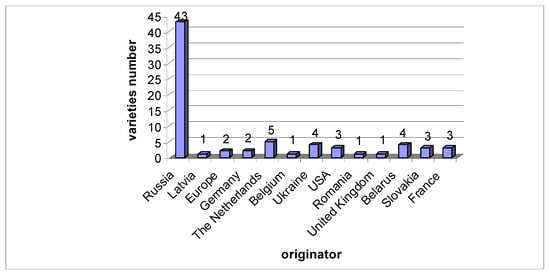 Three species appeared only once in pedigree of the accessions; R. altissimum, according to the data of pedigrees, is the father of Cirald (Cirvya Pists (origin is not known) × R. altissimum); R. warscewiczs is present in the pedigree of Viksne, which is obtained from sowing seeds of Varshevich currant and differs in the cherry color of berries; Skorospelaya (Rannya Favorsky) was obtained in 1937 at the Suifuno-Ussuri fruit and berry experimental station (Primorsky Krai) from the seeds of R. palczewskii.