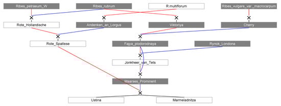 In addition to garden currant (R. vulgare), the pedigrees mention a garden large-fruited variety of currant (R. vulgare var. macrocarpum). In accordance with the pedigrees data, R.vulgare are presented in the pedigree of 15 cultivars: in the 1st generation, there are five cultivars (Gondouin, White cherry, Weisse Hollandische, North Star, Transparent Blanche), in the 2nd generation, there are six cultivars (Red Cross, Batishchevskaya, Shedraya, Niva, Orlovskaya Zvezda, Osipovskaya), and in the third generation, there are three cultivars (Krasnaya Andreichenko, Cascad, Belaya Potapenko) (Figure S4).
