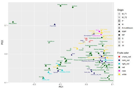 Two cultivars with cherry-colored fruits were included in the study (Cirald and Viksne). These accessions were located next to each other on the scatter plot. According to the pedigree data, they were not related and derived from two different species. At the same time, the revealed similarity in the fruit color and the high homogeneity on a genetic level of Cirald and Viksne may suggest their joint origin. Therefore, additional studies of these samples are required.
