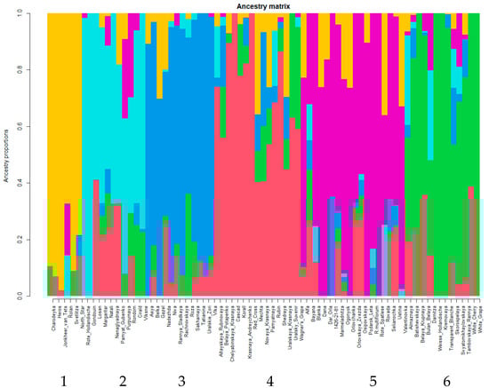 Determination of the appropriate number of clusters (K) based on the cross-entropy criterion by LEA software resulted in K = 6 (Figure S6, Figure 4).