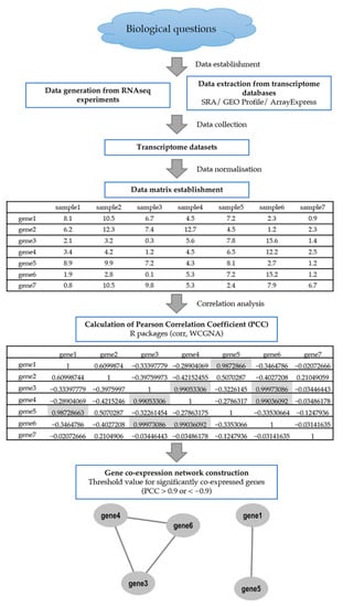 - Emamjomeh, A.; Saboori Robat, E.; Zahiri, J.; Solouki, M.; Khosravi, P. Gene Co-Expression Network Reconstruction: A Review on Computational Methods for Inferring Functional Information from Plant-Based Expression Data. Plant Biotechnol. Rep. 2017, 11, 71–86. [Google Scholar] [CrossRef]