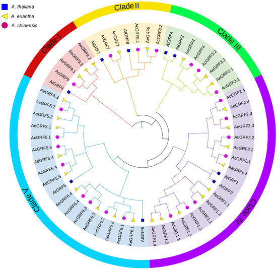 Phylogenetic analysis of AcGRF and AeGRF and AtGRF proteins. Each clade is represented by a different color. The circle shape denotes AcGRF proteins, the triangle shape represents AeGRF proteins and the square shape represents AtGRF proteins.