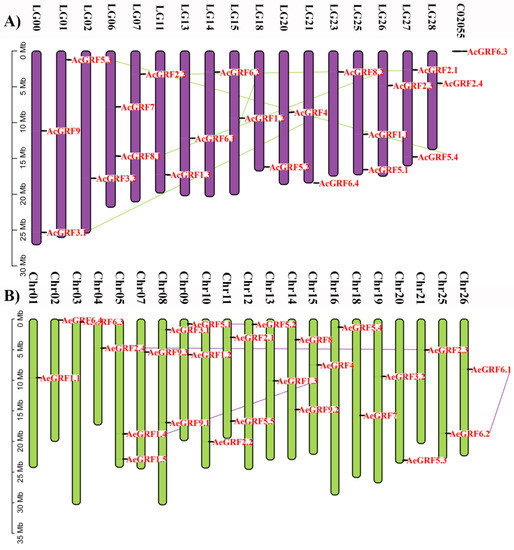 Chromosomal distribution of (A) AcGRF genes, and (B) AeGRF genes. The colored lines in the background show homologous gene pairs.