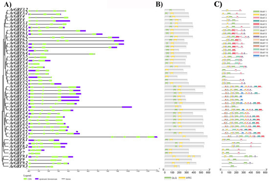 Structural analysis of kiwifruit GRFs. (A) Exon-intron analysis, (B) Identification of conserved domains, (C) Prediction of conserved motifs. The motif sequences are presented in Table S4.