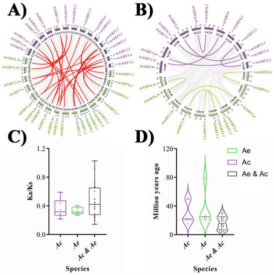 To show the syntenic relationships, the whole genomes of Ac and Ae were aligned by Blastp to do an all-to-all blast and analyzed with MCScanX software for identification of syntenic blocks and duplicated gene pairs. The comparison between Ae vs. Ac genomes resulted in the identification of 27 ortholog gene pairs (Figure 4A). Similarly, the comparison between Ac vs. Ac resulted in six paralog gene pairs, and the comparison between Ae vs. Ae genomes resulted in five paralog gene pairs (Figure 4B). Gene duplication is an important phenomenon that forms a cornerstone for genetic novelty in plants and expansion or contraction of gene families. For an instance, over 90% of functional and developmental genes in A. thaliana have evolved by gene duplication [26]. The most common way to measure the ongoing adaptive evolution in genes is by calculating the ratio of non-synonymous (Ka) to synonymous (Ks) nucleotide substitution in duplicated gene pairs. We determined the selection pressure in duplicated gene pairs of kiwifruit GRF by calculating Ka, Ks, Ka/Ks, and T (divergence time). Generally, Ka/Ks >1 indicates positive selection, Ka/Ks = 1 represents neutral selection, and Ka/Ks < 1 denotes purifying selection [27]. Our results showed Ka/Ks < 1 for all paralog and ortholog gene pairs except AeGRF5.5/AcGRF5.4, suggesting that purifying selection was the main source of evolution for the kiwifruit GRF family (Figure 4C). The divergence time for AcGRF and AeGRF paralog gene pairs ranged between 15.25–50.87 and 19.97–79.55 MYA, respectively. Similarly, the divergence time for ortholog gene pairs between Ac and Ae genomes ranged from 3.29 to 33.83. Additionally, the divergence time for GRF ortholog gene pairs between Ac and Ae genomes was the smallest, while the divergence time of GRF paralog gene pairs in Ae was the greatest (Figure 4D and Table S2).
