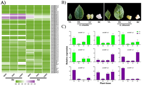 Expression analysis of GRFs in kiwifruit. (A) Heatmap for 22 AcGRFs and 26 AeGRFs under Psa. invasion in Ac and Ae. (B) Phenotype for different kiwifruit tissues used for RT-qPCR analysis. (C) RT-qPCR analysis for nine highly expressed genes from four different RNA-seq datasets. The YL stands for young leaves, OL stands for old leaves, LC stands for callus under light treatment, DC stands for callus under dark treatment, and DPI stands for days post-inoculation of Psa.