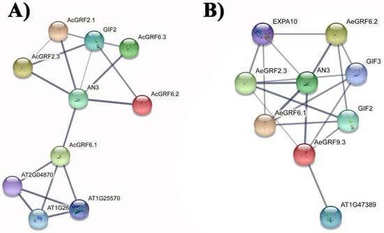 STRING database was employed to predict protein-protein interaction association by finding kiwifruit GRFs orthologs in A. thaliana. Results for Ac proteins showed that AcGRF 2.1, 2.3, 6.1, 6.2, and 6.3 showed association with AN3 (GIF1) and GIF2 (Figure 6A). Similarly, AeGRF 2.3, 6.1, 6.2, and 9.3 showed association with AN3 (GIF1), GIF2, and GIF 3 (Figure 6B). These results indicated that the above-mentioned proteins have affinity to form GRF-GIF regulatory complex in kiwifruit. Three-dimensional structures of nine highly expressing proteins from different RNA-seq datasets were predicted and visualized by Phyre 2 online tool. The results showed highly similar structures for all selected AcGRF and AeGRF proteins, indicating their functional similarity in kiwifruit (Figure S7).