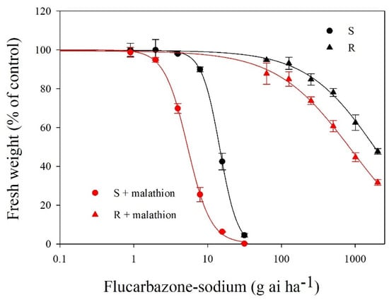 Whole-plant dose-response analysis of the resistance to flucarbazone-sodium and to flucarbazone-sodium with malathion in the S and R B. japonicus populations at 21 DAT.