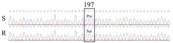 From the R and S B. japonicus populations, partial ALS genes were sequenced. DNA sequence analyses of the ALS genes revealed a single nucleotide substitution of CCC to TCC at codon 197, resulting in a Pro-197-Ser mutation in the R population (Figure 4). All 10 sequenced plants containing the Pro197 mutation were homozygotes. Moreover, no other known amino acid mutations were identified at the Ala122, Ala205, Asp376, Arg377, Trp574, Ser653 or Gly654 positions in any plants sequenced in the R population.