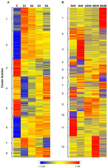 Transcriptomic analyses revealed a total of 4594 genes in K. daigremontiana and 5706 in K. pinnata, which were significantly differentially expressed during plantlet formation between stages and time points after leaf detachment. Genes with similar expression profiles were hierarchically clustered with eight clusters for K. daigremontiana and 12 for K. pinnata (Figure 2). At first glance, K. daigremontiana clustering is dominated by the control condition (leaf margin), which is in contrast with the plantlets. The stages S1–S4 tend to show a linear progression in up- or downregulation. This is in agreement with the PCA for K. daigremontiana, which shows similar linearity in gene regulation. In the control samples (C), K. daigremontiana gene clusters 1, 2, and 6 showed the lowest expression levels, followed by clusters 8, 7, and 4, whereas gene clusters 3 and 5 showed the highest expression levels (Figure 2A). At stage S1, gene clusters 1 and 7 showed the highest expression level, followed by clusters 2, then 3 and 4, and 5, whilst clusters 4 and 8 had the lowest expression level. At stage S2, genes in clusters 1, 2, 6, and 7 exhibited higher expression levels than the other clusters. However, at later stages, S3 and S4, genes within each cluster exhibited greater differences in expression level, as suggested by a display of different colors along the spectrum. In contrast with K. pinnata, this was observed in all gene clusters across most time points (Figure 2B). In K. pinnata, the highest expression level was in cluster 1 at 48 hM; cluster 3 at 4 hN; cluster 11 at 0 hN, and cluster 12 at 48 hN. This was in contrast with K. daigremontiana, as the highest expression level occurred at the same stage C (Figure 2A). Gene clusters in K. pinnata with the lowest expression level were gene clusters 4 at 4 hN, clusters 6 and 8 at 48 hM, and cluster 10 at 0 hN (Figure 2B). Apart from gene cluster 12 at 48 hN, the expression level of all gene clusters at 24 hN and 48 hN was fairly similar.