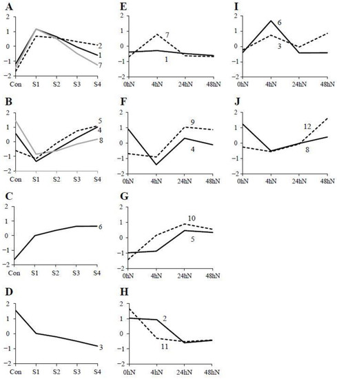 Graphical representation of average change in expression of genes in different gene clusters. (A–D) The expression pattern of eight gene clusters in K. daigremontiana across different plantlet developmental stages. (E–J) The expression pattern of twleve gene clusters across different time points after detachment of K. pinnata leaf. Clusters of genes with a similar trend of changes in expression are visualized on the same graph. The number adjacent to each graph line corresponds to the number of the gene cluster. Con: Control; S1: Stage 1; S2: Stage 2; S3: Stage 3; S4: Stage 4; N: Leaf notches.
