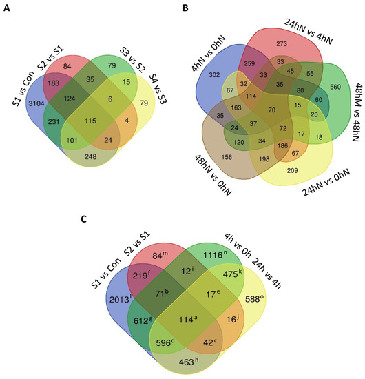 Venn diagrams showing the number of differentially expressed genes (DEGs) during plantlet formation. The number of DEGs overlapped from a comparison of (A) different plantlet developmental stages from K. daigremontiana or (B) samples harvested at specific time points upon K. pinnata leaf detachment. (C) The number of exclusive and overlapping differentially expressed genes between selected plantlet stages from (A) and time points from (B). Superscript alphabets correspond to the list of genes in Table S1 Con: Control; S1: Stage 1; S2: Stage 2; S3: Stage 3; S4: Stage 4; N: Leaf notches; M: Leaf mid-section.