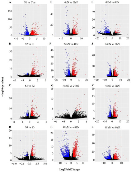 Volcano plots showing statistical significance of changes in gene expression and their expression fold-change during plantlet formation. Each plot shows a comparison between two developmental stages of plantlet formation in K. daigremontiana (A–D) or between two time points post-detachment of K. pinnata leaves (E–L). Each plot shows −log10 (p-value) against log2 fold-change. Blue: False discovery rate (FDR) ≤ 0.05, log2 fold-change ≤ −0.6 for (A–D), log2 fold-change ≤ −1.585 for (E–L); Red: FDR ≤ 0.05, log2 fold-change > 0.6 for A–D, log2 fold-change > 1.585 for (E–L); Black: Not significant. Con: Control; S1: Stage 1; S2: Stage 2; S3: Stage 3; S4: Stage 4; N: Leaf notches; M: Leaf mid-section.