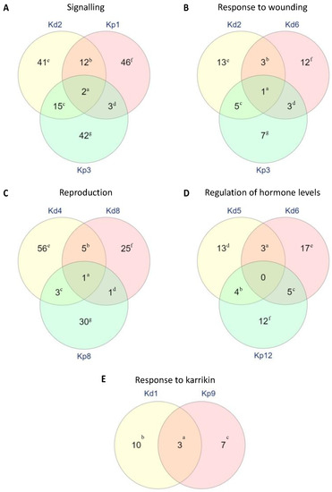 Number of genes in selected GO terms that are overlapped between different clusters of two Kalanchoë species, K. daigremontiana (Kd) and K. pinnata (Kp). Genes in signalling (A), response to wounding (B), reproduction (C), regulation of hormone levels (D) and response to Karrikin (E). The numerical value next to the species name symbol (Kd, Kp) represents the corresponding gene cluster in Figure 2. The numerical value in the Venn diagrams represents the number of genes. Superscript alphabets correspond to the list of genes in Table S1.