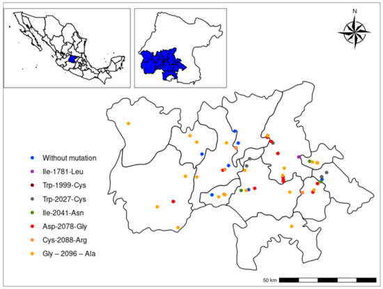 The leaf plant tissue and seeds collection was carried out in the southwestern portion of Mexico’s Bajio region. In recent years, this region has increased the number of reports of failures in weed control. We collected leaves and seeds from 70 farms where chemical control is the only mode of weed control and where the presence of resistant individuals is evident (null or very deficient control of weeds). The name of each accession was established according to the name of the municipality where it was collected (Figure 1).