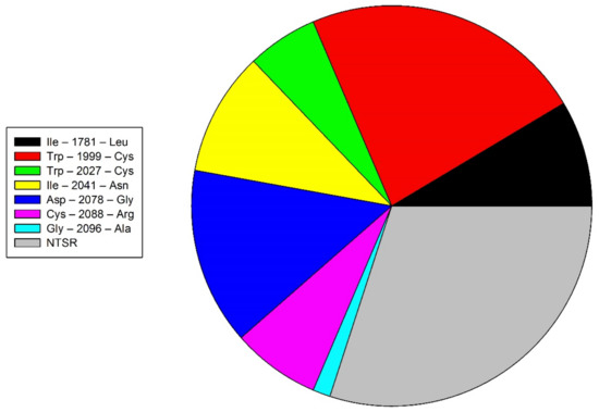 According to the level of resistance conferred by the type of mutation, the mutants Ile–1781–Leu, Asp–2078–Gly, and Cys–2088–Arg were resistant to the three chemical families ACCase-inhibiting herbicides (cross-resistance) and represent 43% of the biotypes with TSR. The mutants Trp–2027–Cys and Ile–2041–Asn are considered medium resistant and present in 22% of the accessions. Finally, the last 36% are confirmed by the mutants Trp–1999–Cys, Ile–2041–Val, and Gly–2096–Ala, which show reduced resistance to ACCase-inhibiting herbicides (Figure 2).