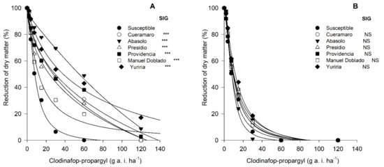 Dose–response tests of biotypes of Avena fatua L. resistant to ACCase-inhibiting from the Bajio, Mexico. In (A), the test was made only with clodinafop–propargyl (0, 1.87, 3.75, 7.5, 15, 30, 60, 120, and 240 g a. i. ha−1). In (B), malathion was applied one hour before the herbicide application. Asterisk indicates significant statistical (p ≤ 0.001) with respect to susceptible biotype, NS indicates non-significant differences.