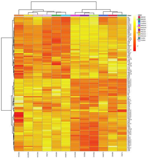 Metabolic fingerprint of populations of Avena fatua L. resistant to ACCase-inhibiting herbicides from the Bajio, Mexico. The heatmap is constructed with 100 metabolites with the highest ionization. The colors represent the abundance of the metabolites. The ions are clustered according to their R correlation (left dendrogram), while the treatments are also clustered according to their R correlation (top dendrogram). The first four letters indicate the name of the populations: Abasolo (ABAS), Yuriria (YURI), Cueramaro (CUER), Manuel Doblado (MADO), Presidio (PRES) and Providencia (PROV). Treatments with herbicides are indicated with the letter C (control conditions) and H (herbicide application).