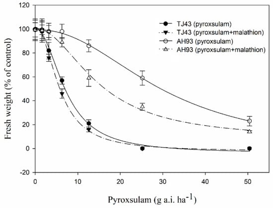 Dose–response curves after pyroxsulam treatment with or without malathion in the resistant (AH93) and susceptible (TJ43) black grass populations. Fresh weights were measured after 21 days of treatment and are represented as a percentage of the untreated control value.