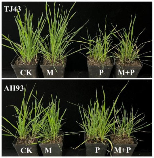 The resistant (AH93) and susceptible (TJ43) black grass plants 21 days after pyroxsulam treatment with or without malathion. CK, untreated; M, malathion (1000 g ai ha−1) treatment; P, pyroxsulam (12.6 g ai ha−1) treatment; M + P, malathion (1000 g ai ha−1) plus pyroxsulam (12.6 g ai ha−1) treatment.