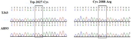 As the AH93 population showed multiple resistance to pinoxaden, the target ACCase gene was amplified and sequenced. Comparation of ACCase revealed a TGG to TGT substitution at amino acid position 2027 (Trp-2027-Cys) in eight individuals of the AH93 population. In addition, a TGC to CGC substitution at amino acid position 2088 (Cys-2088-Arg) was found in two individuals of the AH93 population (Figure 3). Both Trp-2027-Cys and Cys-2088-Arg mutation have double peaks and are heterozygous mutations.