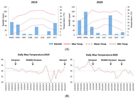 (A) Monthly evolution of temperatures and rainfall recorded in the Muses Valley during 2019 and 2020; (B) Daily evolution of maximum temperatures (above 30 °C) recorded in the Muses Valley during 2019 and 2020. Arrows indicate the three sampling dates (veraison, middle veraison and harvest).