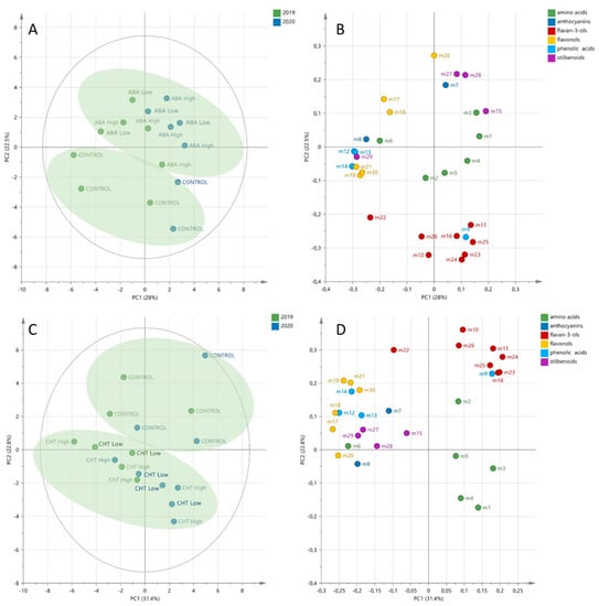 Unsupervised classification using principal component analysis on metabolomic data from grape berries of cultivar Savvatiano at veraison stage in 2019 and 2020 treated with abscisic acid (A,B) and chitosan (C,D). Samples in the score plots (A,C) were colored according to the vintage, and variables in loading plots (B,D) were colored according to the metabolic class. Numbers indicate the ID of metabolites, as follows: L-proline (m1); L-leucine (m2); L-isoleucine (m3); L-phenylalanine (m4); L-tyrosine (m5); L-tryptophan (m6); cyanidin-3-O-galactoside (m7); peonidin-3-O-(6-p-coumaroyl-glucoside) (m8); gallic acid (m9); catechin (m10); epicatechin (m11); coutaric acid (m12); caftaric acid (m13); fertaric acid (m14); E-piceid (m15); catechin-gallate (m16); kaempferol-3-O-glucoside (m17); quercetin-3-O-glucoside (m18); quercetin-3-O-glucuroside (m19); quercetin-3-O-glucuronide (m20); myricetin-glucoside (m21); procyanidin B1 (m22); procyanidin B2 (m23); procyanidin B3 (m24); procyanidin B4 (m25); procyanidin-gallate (m26); E-resveratrol (m27); E-piceatannol (m28); E-ε-viniferin (m29); kaempferol-3-O-rutinoside (m30).