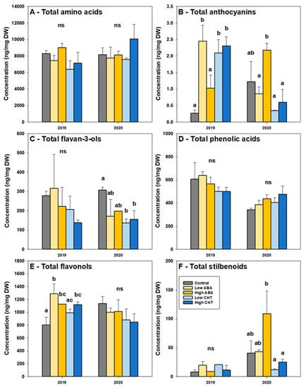 Total concentrations of amino acids (A), anthocyanins (B), flavan-3-ols (C), phenolic acids (D), flavonols (E) and stilbenoids (F) in Savvatiano berries at veraison stage in 2019 and 2020 treated with abscisic acid and chitosan: control (grey), low concentration of abscisic acid (light yellow), high concentration of abscisic acid (dark yellow), low concentration of chitosan (light blue) and high concentration of chitosan (dark blue). Error bars represent the standard deviations. No significant difference (ns) was found between values with the same letters (one-way ANOVA, p-value > 0.05).