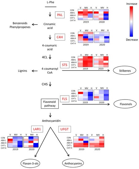 Considering that the grape phenolic composition depends on the transcriptional changes induced by environmental conditions, it was challenging to complement our study with an expression analysis of the target genes encoding the key enzymes of the phenylpropanoid biosynthetic pathway. Recently, accumulated results from transcriptomic studies revealed the differential expression of the phenylpropanoid pathway genes, due to biostimulant applications [12,13,14,15,49]. Herein, we showed that the expression level of VviPAL and VviC4H was nearly constant during the grape berry maturation in untreated plants, while the VviSTS exhibited a significant increase throughout ripening and the VviFLS expression was found to decline towards harvest. An increase was also observed in the VviUFGT gene expression at the harvest stage of 2020. The ABA and CHT applications resulted in increased VviPAL and VviUFGT expression levels, respectively, while both of the treatments resulted in an early upregulation of the VviSTS gene expression. However, in certain cases the treatment effect on the gene expression was also dependent on the vintage. For instance, the VviC4H and VviFLS and expression level were increased in the treated plants compared to the controls at the veraison stage of the 2019 vintage, while no difference was observed the following year.