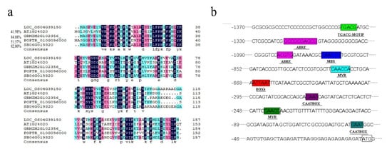 Bioinformatics analysis of OsMLP423. (a) Analysis of homologous amino acid sequence of OsMLP423. (b) Analysis of the relevant elements of the promoter region.