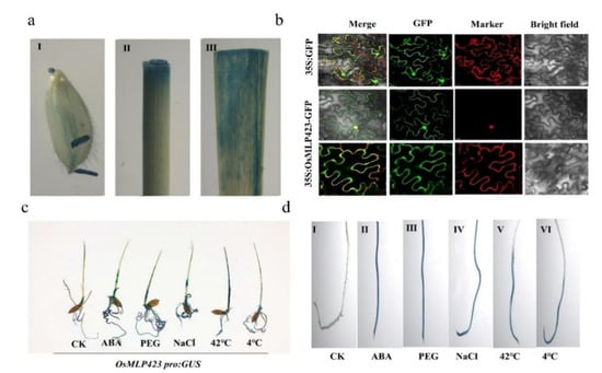 Expression pattern analysis of OsMLP423. (a) OsMLP423pro:GUS transgenic plants showed staining of different tissues. (I: glumes; II: stems; III: mature leaf.) (b) Subcellular localization of OsMLP423 in tobacco. Scale bars are 20 mm. (c) GUS staining of OsMLP423pro:GUS transgenic plants under different stress treatments. (d) Detection of GUS activity in roots of OsMLP423 promoter under abiotic stress. (Ⅰ: CK; Ⅱ: ABA; Ⅲ: PEG-6000; Ⅳ: NaCl; Ⅴ: 42 °C; Ⅵ: 4 °C).