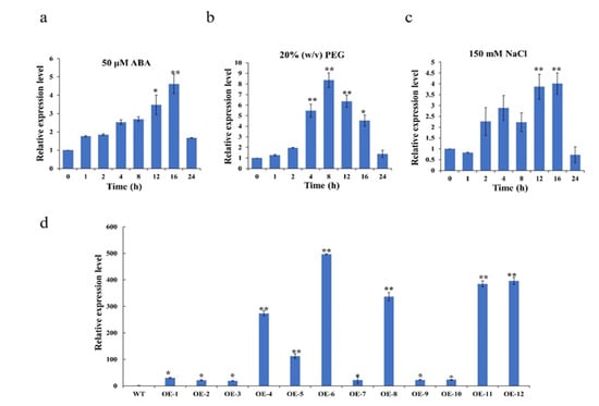 Wild-type and overexpression seeds were sterilized with 2% (v/v) NaClO solution for 30 min and were then incubated at 28 °C with a relative humidity of 70% and 14 h light/10 h dark cycle. The sterilized seeds were placed in 50 μM ABA solution for germination, and the germinated seeds were counted every day until the seventh day, and the control group was placed in the solution without ABA. The early seedlings (bud length of about 2 mm) were placed in 50 μM ABA solution for 9 days and 20% (w/v) PEG and 150 mM NaCl solution for 7 days, and the height of each plant was measured. Finally, the seedlings were cultured in sandy soil for 14 days; then, watering was stopped for 10 days to simulate field drought until the leaves curled, followed by recovery with normal watering for another 5 days to determine the survival rate.