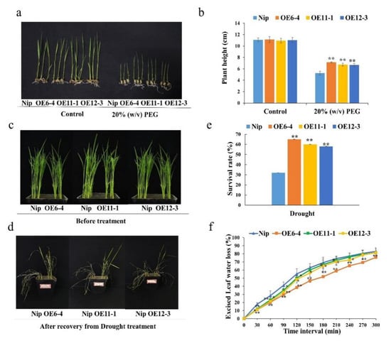 Given that OsMLP423 expression was induced by drought stress, to test its function to drought stress tolerance, wild-type and transgenic lines were treated with a 20% w/v PEG solution at seedling stage, and a few overexpressed plants were randomly selected to measure the plant heights after one week of treatment. Plant heights of transgenic and wild-type plants were not different under control conditions. However, after 7 days of the 20% w/v PEG treatment, the heights of transgenic lines OE6-4, OE11-1, and OE12-3 were significantly higher than the wild type (Figure 4a,b). The above-mentioned young seedlings were transferred to sandy soil for 2 weeks, and then watering was stopped for 5 days (leaves started curling), and then they were returned to a normal water supply for 12 days. Compared with the wild type, overexpression lines showed less severe symptoms of drought stress, with delayed and less leaf curling. After the restoration of watering, the survival rate of wild-type plants was 32% and the overexpression lines had an average survival rate of 60% and also showed a lower water loss rate than the control (Figure 4c–f).