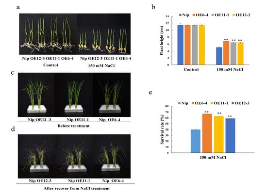 Given that OsMLP423 expression was induced by salt stress, to test its function regarding salt stress tolerance, the overexpression and wild-type lines were treated with a 150 mM sodium chloride solution, and the control group was treated with a standard solution without NaCl. After 7 days of treatment, we observed that the heights of the overexpression lines were similar to that of the wild-type line under normal conditions. However, after the 150 mM NaCl treatment, the plant heights of the overexpression lines OE6-4, OE11-1, and OE12-3 were significantly higher than that of the wild-type line (Figure 5a,b). After the NaCl treatment, plants were transferred to the standard solution without NaCl for 10 days, and the average survival rate (63%) of the overexpressing lines was significantly higher than that of the wild type (40%) (Figure 5c–e).