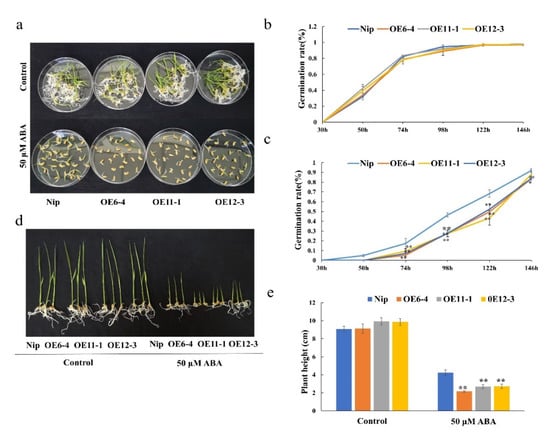 ABA treatment of OsMLP423 transgenic lines. (a) Germination of OsMLP423 overexpression lines treated with 50 μM ABA for 7 days. (b) Line graph of germination rate of OsMLP423 overexpression plants in normal water culture for 7 days. (c) Line graph of germination rate of OsMLP423 overexpressing plants treated with 50 μM ABA for 7 days. (d) OsMLP423 transgenic plants treated with 50 μM ABA for 9 days. (e) Relative plant heights. Values are mean ± SE (n = 3). Asterisks indicate significant differences between transgenic lines and WT (* p < 0.05, ** p < 0.01). n = 20 plants per treatment.