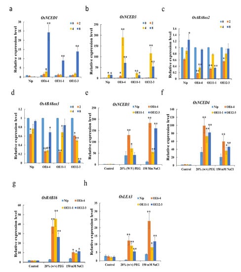Expression analysis of ABA-related genes under different stress conditions. (a–d) The analysis of the expression levels of OsNCED1, OsNCED3, OsABA80x2, and OsABA80X3, respectively, under 50 μM ABA treatment. (e–h). The analysis of the expression levels of OsNCED3, OsNCED4, OsRAB16, and OsLEA3, respectively, under 20% w/v PEG and 150 mM NaCl stress. Leaf samples were collected during 24h treatment. Values are mean ± SE (n = 3). Asterisks indicate significant differences between transgenic lines and WT (* p < 0.05, ** p < 0.01). n = 20 plants per treatment.