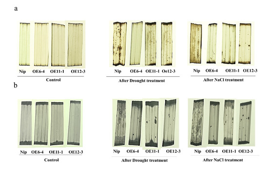 Accumulation of reactive oxygen species in OsMLP423 transgenic plants. (a) DAB staining was used to detect superoxide anion (O2−) in the plants overexpressing OsMLP423 before and after drought and salt treatments. (b) Hydrogen peroxide accumulation in plants overexpressing OsMLP423 before and after drought and salt treatments was detected using NBT staining.