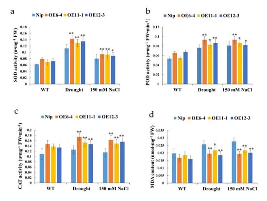 In addition, the activities of SOD, POD, and CAT under salt and drought stresses were detected. The results showed that there was no significant difference in the activities of superoxide dismutase, peroxidase, or catalase between the overexpression lines and the wild type under the control conditions, whereas under the salt and drought stress conditions, the overexpression lines exhibited significantly greater enzymatic activity than the wild type (Figure 9a–c). We also found that the content of MDA in the overexpression lines was significantly lower than that in the wild type, indicating that the OsMLP423 overexpression lines had less cell membrane oxidative damage under stress conditions (Figure 9d).