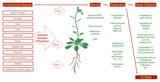 The continuous growth of human population is a major threat to global food security. The situation is worsening with the increasing demand for biomass as raw material for industrial use. Therefore, food production and industrial interests are competing for resources as can be observed, for instance, in the case of the food–feed–fuel competition [1]. Global scarcity of water resources, increased environmental pollution, and salinization of soil and fresh water are adding to this problem [2]. In addition, we have to consider that global climate change will increase the probability of the occurrence of extreme environmental situations. Among these, high winds, extreme temperatures, drought, and flood are reported. In their study, Daryanto et al. (2016) [3] have analyzed information on crop yield, which was published from 1980 to 2015. Worldwide, water limitation has caused up to 21 and 40% yield reductions in wheat and maize, respectively. Moreover, soil salinity results in major reductions in cultivatable land area, and decreases crop productivity and quality. This is particularly the case in salt-affected farmland in the arid irrigation area, with an approximate rate of around 1–2% annually [4]. By 2050, it is estimated that 50% of all arable land will be impacted by salinity [5]. Currently, almost 1 billion ha of arable land is affected by salinity, representing about 7% of the Earth’s continental area [5]. In addition, reduced productivity is causing more than USD 12 billion in annual losses [6,7]. Global food production is required to double by the year 2050 to meet the ever-growing demands of the population [8]. Therefore, understanding the mechanisms underlying plant abiotic stress responses and the generation of plants that are resistant to environmental stress has received considerable attention in recent years [9]. Stress-resistant plants can initiate a variety of changes at the molecular, cellular, and physiological traits as well as signal transduction pathways, to survive under adverse environmental conditions [10,11]. In this context, we have to separate between short-term heatwaves or heavy rainfall and long-term events extending over periods of several weeks [12]. In particular, these long lasting events will affect the environment as a whole, and in terms of agricultural land use, will require the respective adaptation of cropping. With recent progress in advanced genomics and high-throughput sequence technologies, genes involved in many of the essential steps that regulate the molecular mechanism as well as stress-responsive genes have been identified and characterized. The identification of stress signaling molecules, transduction pathways, and discovery of ABA receptors have significantly improved our understanding of functions as well as transcriptional and post-transcriptional regulation of stress-responsive gene expression [13].