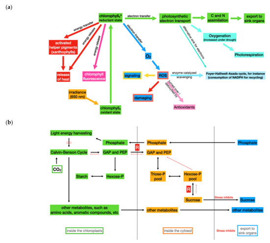 In many publications on stress responses, the following question was addressed: What is the reason for the over-production of ROS as a common response to different stress events, such as water shortage, high light intensity, heavy metal contamination, etc. Moreover, what these stresses have in common is that the export of assimilates and assimilate usage in sink organs are inhibited. Therefore, increased assimilate concentration in leaf tissues will result in an inhibited carbohydrate export from the chloroplasts [100,101,102]. Inhibition of the Calvin–Benson cycle will inhibit the consumption of NADP+ and ATP. Both coenzymes will not be recycled to function as primary acceptors of photosynthetic energy flow. The concentration of the chloroplastic pools of these two coenzymes is extremely low (about 1 mM) [103,104]. Therefore, functioning of the photosynthetic electron transport and reduction of ROS production depends on a permanent recycling of the two energy acceptors NADP+ and ADP [68,70,71,80] (see Figure 2b for an overview).