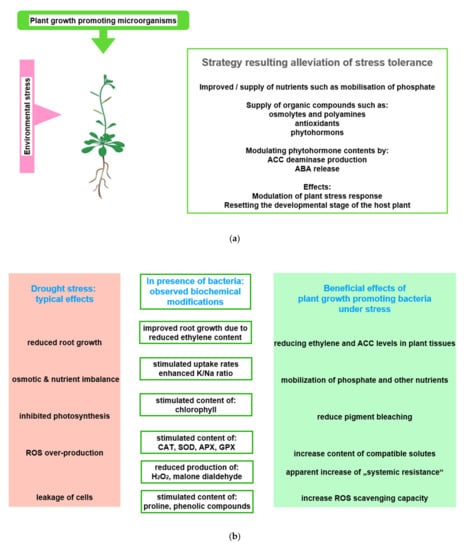 Beneficial effects of plant growth promoting microorganisms (PGPMs). (a) Observed stress ameliorating effects of PGPMs: The figure symbolizes the service offered by PGPMs, which helps in hosting plants to improve stress tolerance; (b) physiological basis of observed effects: Using drought stress as an example, typical stress effects are listed in the first column. Column two shows how PGPMs modify the biochemical stress response at biochemical level. In column three, the stress responses ameliorated by PGPMs are listed; (c) how PGPM activities interfere with the development of plant stress response: The boxes symbolize how PGPM activity may integrate into the reaction sequence, leading to plant stress tolerance. Abbreviations: APX: Ascorbate peroxidase; CAT: Catalase; GPX: Glutathione peroxidase; SOD: Superoxide dismutase.