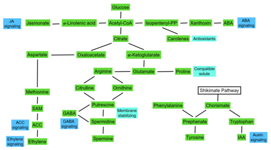 However, data concerning the TCA cycle can sometimes be misinterpreted and misleading. For instance, antioxidants will be degraded under prolonged and intensive stress. However, when monitored over time, the concentration will show a maximum and this maximum will be shifted in the presence of PGPB [67]. While overproduction of these compounds is preferentially achieved by stimulation of plant metabolism, it is assumed that increased concentrations of metabolites of the indol pathway are based on the import of precursors delivered by PGPB. This applies for shikimic, quinic, and salicylic acids [150]. The latter compound functions as a messenger in the hosting plant.