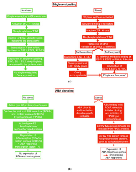 Stress effects on ethylene and ABA signaling. (a) Ethylene signaling: The figure indicates how ethylene signaling is modified by stress; (b) ABA signaling: The figure indicates how ABA signaling is modified by stress. Abbreviations: EBF1: A transcription factor controlling cell differentiation; EIL1: A transcription factor regulating genes that are responsive to sulfur deficit, for instance; EIN2: A factor involved in histone acetylation; ERF: Transcription factor involved in stress responses; PP2C: Protein phosphatase 2C; PYL: Pyrabactin resistance1/PYR1-like regulator component of the ABA receptor; SCF-E3: Serine ubiquitin ligase; SnRK2: A serine/threonine protein kinase.