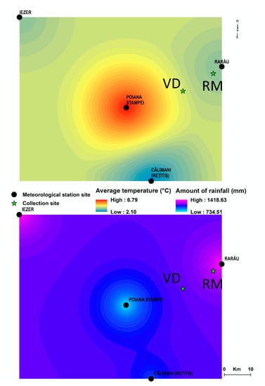 Map of average annual temperatures and average annual cumulative precipitation level for 2020 (sample collection year), for the two collection sites, based on the interpolation of data from 4 weather stations in the region (Poiana Stampei, Rarău, Călimani-Rețitiș, Iezer). The collection sites are labelled on the climatic maps as VD, for the Vatra Dornei sample, and RM, for the Rarău Mountains sample. Data source: meteomanz.com (accessed on 7 April 2022) [29].