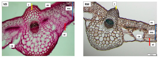 Transversal section of the T. farfara foliar limb through the median vein and mesophyll. Left: Vatra Dornei sample (VD); right: Rarău Mountains sample (RM). Legend: es—upper epidermis; ei—lower epidermis; mo—homogenous mesophyll; c—collenchyma; ca—air lacunae.